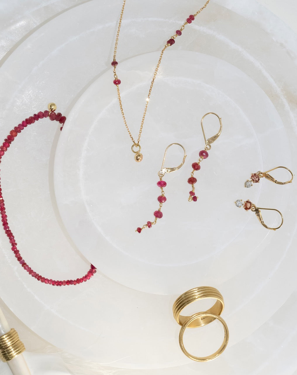 In pieces like the Berry Red Threaded Bracelet and Berry Red Dotted Chain with Golden Globe Drop, you’ll find rich red spinels that look like wintry berries, paired with buttery gold details.
