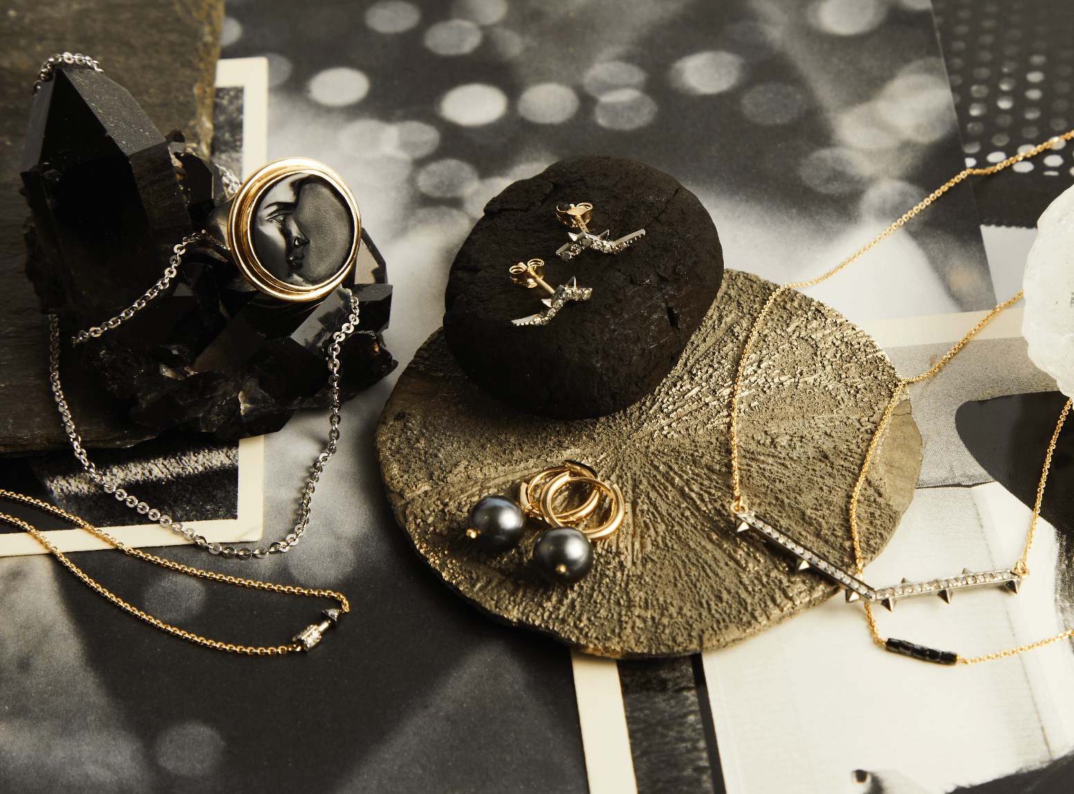 Our newest collection mixes dark romance with low-key witchy glamour. The pieces combine the steely midnight tones of antiqued silver with shimmering black peacock pearls and rustic diamonds for understated, laid-back sparkle.